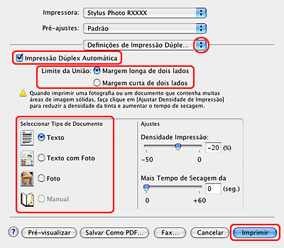 Seleccione uma das definições para Seleccionar Tipo de Documento. As definições Densidade Impressão e Mais Tempo de Secagem da Tinta são ajustadas automaticamente.