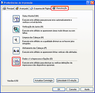 Faça clique no separador Manutenção e, em seguida, seleccione Dados s/ a Impressora e Opções.