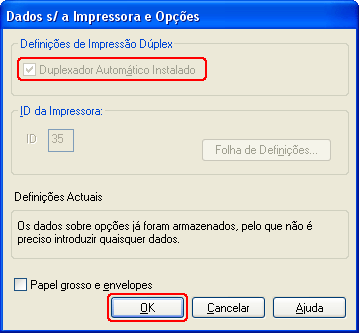 Certifique-se de que a caixa de verificação Duplexador Automático Instalado está seleccionada e faça clique em OK.