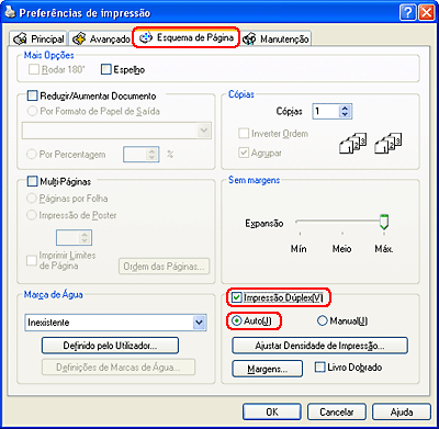 Faça clique no separador Esquema de Página e, em seguida, seleccione a caixa de verificação Impressão Dúplex e o botão Auto. Se pretender criar um livro dobrado, seleccione a caixa de verificação Livro Dobrado.