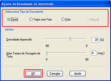 Se pretender imprimir dados de densidade elevada, como fotografias ou gráficos, é aconselhável efectuar as definições na janela Ajuste da Densidade de Impressão.