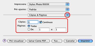 Seleccione a impressora que está a utilizar para a definição Impressora. Em seguida, efectue as definições para Cópias & Páginas.