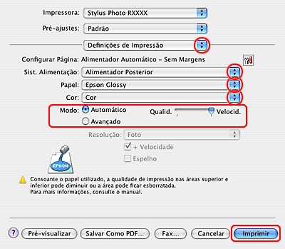 Seleccione as definições adequadas para Sistema Alim., Papel, Cor e Modo. Para mais informações sobre Definições de Impressão, consulte a ajuda interactiva.