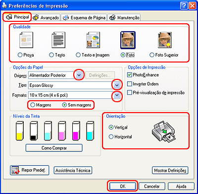 Seleccione XXX (Alimentador Automático - Sem Margens) se pretender imprimir fotografias sem margens.