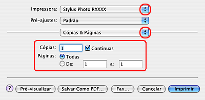 Seleccione a impressora que está a utilizar para a definição Impressora. Em seguida, efectue as definições para Cópias & Páginas.