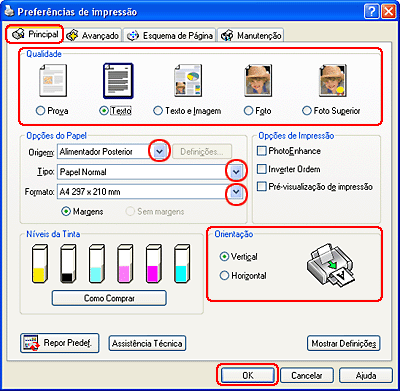 Seleccione as definições adequadas para Sistema Alim., Papel, Cor e Modo. Para mais informações sobre Definições de Impressão, consulte a ajuda interactiva.