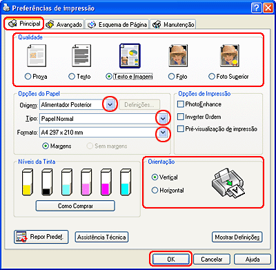 Seleccione as definições adequadas para Sistema Alim., Papel, Cor e Modo. Para mais informações sobre Definições de Impressão, consulte a ajuda interactiva.