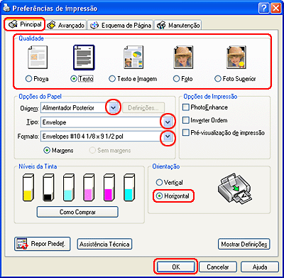 Seleccione Envelope para a definição Papel e, em seguida, seleccione as definições adequadas para Cor e Modo. Para mais informações sobre Definições de Impressão, consulte a ajuda interactiva.