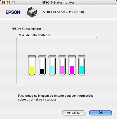 O gráfico apresenta o estado dos tinteiros quando abriu o EPSON StatusMonitor pela primeira vez. Para actualizar o estado dos tinteiros, faça clique em Actualizar.