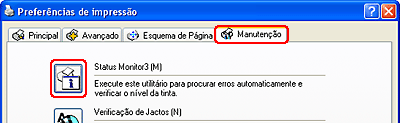 Abra o controlador de impressão, faça clique no separador Manutenção e, em seguida, na tecla Status Monitor 3.