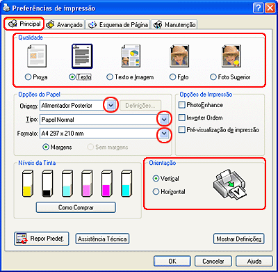 Seleccione Vertical (altura) ou Horizontal (largura) para alterar a orientação da impressão.