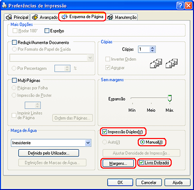 Faça clique no separador Esquema de Página, seleccione Impressão Dúplex e, em seguida, seleccione o botão Manual. Em seguida, faça clique na caixa de verificação Livro Dobrado.