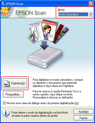 Se a caixa de Modo situada no canto superior direito da janela estiver definida para Modo Automático, clique no botão Digitalizar. O Epson Scan digitaliza automaticamente a imagem e guarda-a como um ficheiro JPEG na pasta Imagens ou As minhas imagens. Para mais informações sobre como seleccionar as definições opcionais, consulte Utilizar o Modo Automático. ![]()