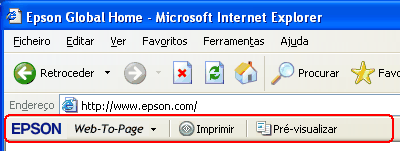 Depois de instalar o EPSON Web-To-Page, a barra de menus aparece na barra de ferramentas do Microsoft Internet Explorer. Se não aparecer, seleccione Barras de ferramentas no menu Ver do Internet Explorer e, em seguida, seleccione EPSON Web-To-Page.