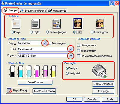 Efectue as definições Papel, Tinta e Modo adequadas. Para obter mais informações sobre as definições de impressão, consulte a ajuda interactiva.