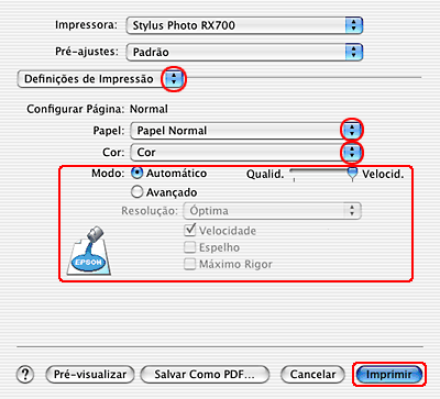 Efectue as definições Papel, Tinta e Modo adequadas. Para obter mais informações sobre as definições de impressão, consulte a ajuda interactiva.