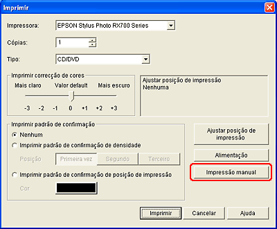 Para obter informações, consulte a Ajuda do EPSON Print CD. Pode igualmente utilizar a folha de verificação da posição de impressão do CD/DVD fornecida com este produto para verificar a posição de impressão.