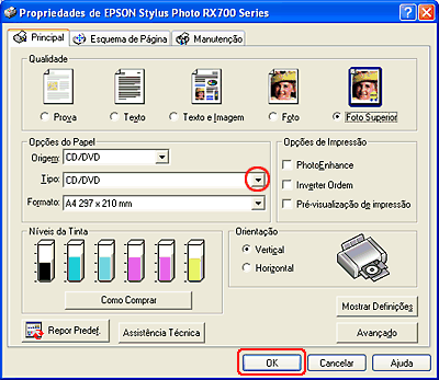Seleccione CD/DVD ou Superfície Premium CD/DVD para a definição Tipo.