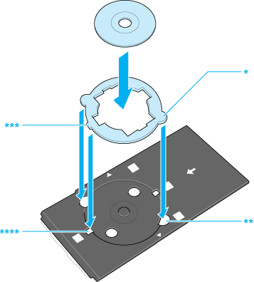 Posicionando o CD/DVD com o lado imprimível para cima, insira cuidadosamente o suporte do CD/DVD ao longo da base do guia do CD/DVD até que as marcas do suporte e do guia correspondam.