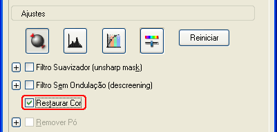 A função de restauração de cor do software do digitalizador permite recuperar cores esbatidas em películas e fotografias. Para restaurar a cor, seleccione a caixa de verificação Restaurar cor na secção de ajustes (é possível que tenha de arrastar a barra de deslizamento para ver a parte inferior do ecrã).