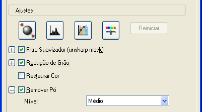 Quando aparecer o efeito granulado na imagem digitalizada, seleccione a caixa de verificação Reduzir grão e volte a fazer clique em Digitalizar para os reduzir. Se seleccionar um nível de redução do granulado mais elevado, a imagem digitalizada fica mais suave.