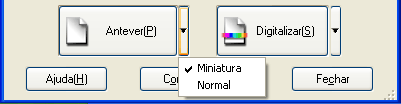 Faça clique na tecla Antever no modo casa ou profissional para iniciar a pré-digitalização e pré-visualizar a imagem. Consoante o modo de digitalização e as definições do tipo de documento, poderá aparecer uma pequena seta à direita da tecla Antever que permite seleccionar um método de pré-visualização. Faça clique na seta e seleccione Miniatura ou Normal para alterar o método de pré-visualização.