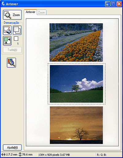 O método de pré-visualização normal permite ver toda a imagem pré-visualizada e os efeitos das definições que efectuou. Permite ainda efectuar ajustes de imagem adicionais. Pode também utilizar demarcações para digitalizar apenas as partes seleccionadas de uma imagem. Para obter mais informações sobre demarcações, consulte Utilizar demarcações.