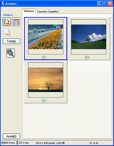 Para ampliar uma miniatura, seleccione a miniatura pretendida e faça clique no separador Tamanho Completo. Aparece uma ampliação da imagem seleccionada no menu Tamanho Completo onde pode visualizar com mais pormenor os efeitos das definições efectuadas.