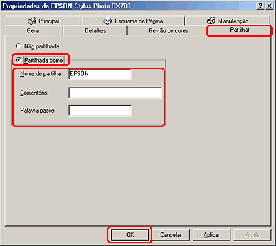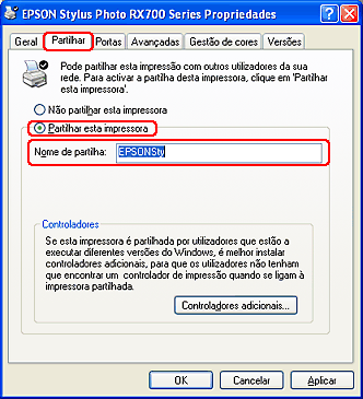 Seleccione a opção Partilhar Impr. e escreva um nome para a impressora partilhada.