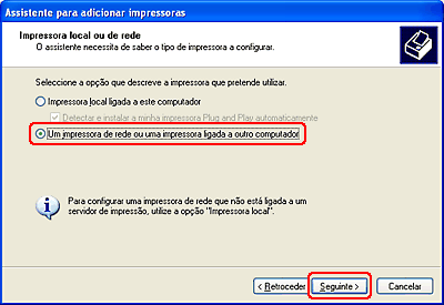 Em Windows XP, seleccione Uma impressora de rede ou uma impressora ligada a outro computador e faça clique em Seguinte.