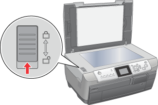 Abra a tampa do digitalizador e faça deslizar a patilha de protecção, conforme indica a figura, para bloquear o carreto do digitalizador.
