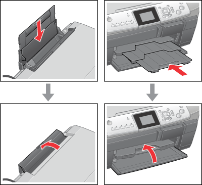 Feche o guia do CD/DVD se estiver aberto. Em seguida, feche o suporte de papel, a protecção do alimentador, o receptor de papel e o alimentador frontal.