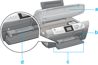 b. Suporte de papel: Suporta o papel colocado no alimentador posterior.