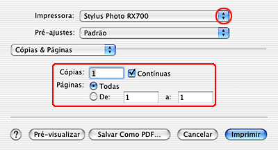 Seleccione Stylus Photo RX700 para a definição Impressora e, em seguida, efectue a definição Cópias & Páginas.