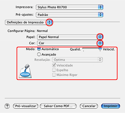 Seleccione Stylus Photo RX700 para a definição Impressora.