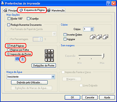 Faça clique no separador Esquema de Página, seleccione Multi-Páginas e, em seguida, Impressão de Poster. Faça clique na seta para cima ou para baixo para seleccionar 2x2, 3x3 ou 4x4.