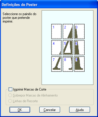 Segue-se um exemplo de como criar um poster com a opção 2x2 seleccionada em Impressão de Poster e com a opção Sobrepor Marcas de Alinhamento seleccionada como marcas de corte da impressão. Siga igualmente as figuras apresentadas.