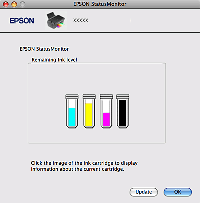 ![]() Pode também executar este utilitário para verificar o estado dos tinteiros antes de imprimir. O EPSON StatusMonitor apresenta o estado dos tinteiros na altura em que foi aberto. Para actualizar o estado dos tinteiros, faça clique em Update (Actualizar).
