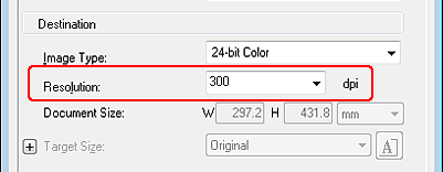 Se pretender ampliar as imagens no Epson Scan para as poder utilizar com um formato superior, pode aceitar a definição de Resolution (Resolução) efectuada pelo Epson Scan com base na definição de Destination (Destino) (apenas no Home Mode (Modo Casa)).