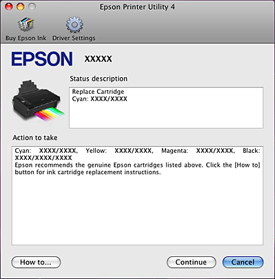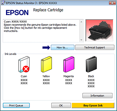 Se houver pouca tinta ou se a tinta acabar, aparece a tecla How to (Como) na janela do EPSON Status Monitor 3. Se clicar em How to (Como), serão apresentadas instruções de substituição dos tinteiros e a cabeça de impressão desloca-se para a posição de substituição dos tinteiros.