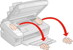 ![]() Se ficar papel encravado perto do alimentador posterior ou do receptor, retire o papel com cuidado.