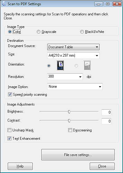 Clique em Settings (Definições). Aparece a janela Scan to PDF Settings (Def. Digit. para PDF).