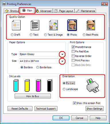 Faceţi clic pe fila Main (Principal) şi selectaţi una din următoarele setări Quality Option: