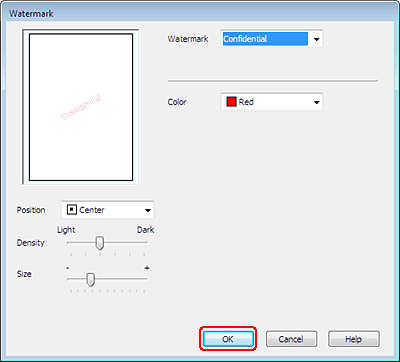 Asiguraţi-vă că este selectat filigranul adecvat din lista Watermark, apoi selectaţi setările Color, Position, Density, Size (Format), Font, Font Style şi Angle. (Pentru detalii, consultaţi sistemul de asistenţă online.) Setările selectate sunt reflectate în fereastra de previzualizare.