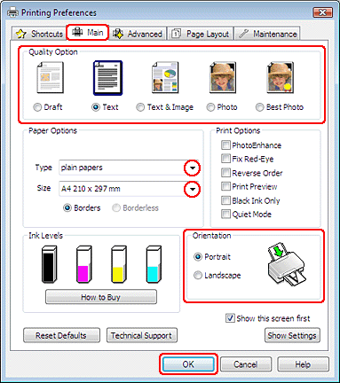 Selectaţi setările Paper Size (Format hârtie) şi Orientation adecvate. Puteţi defini, de asemenea, un format de hârtie particularizat. Pentru detalii, consultaţi sistemul de asistenţă online.