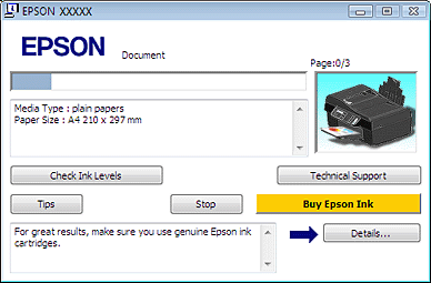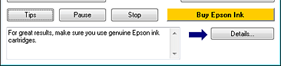 Tips (Sfaturi)Diferitele sugestii pentru eficientizarea utilizării driverului imprimantei Epson sunt afişate în caseta de text a ferestrei barei de progres. Pentru detalii suplimentare privind sugestia afişată în fereastră, faceţi clic pe butonul Details (Detalii).