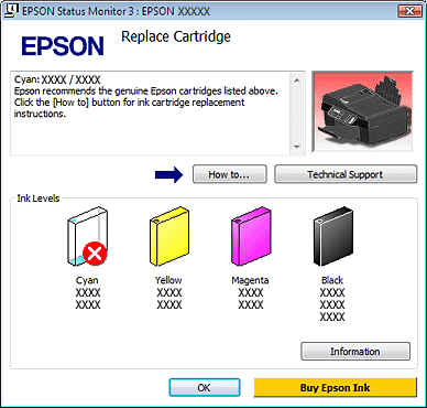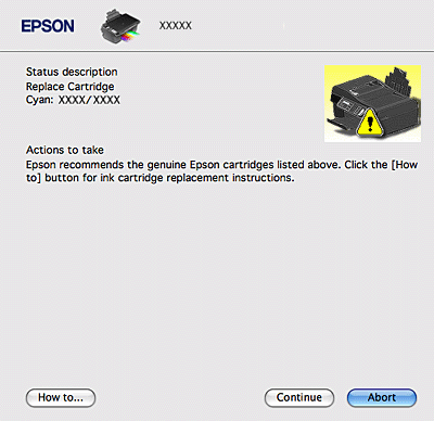 ![]() Când cerneala este insuficientă sau consumată complet, este afişat un buton How to (Cum). Faceţi clic pe How to (Cum) şi EPSON StatusMonitor vă va conduce prin etapele necesare schimbării cartuşului de cerneală.