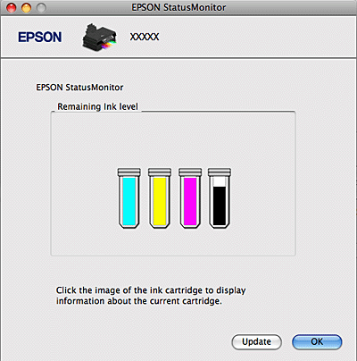 ![]() Puteţi utiliza acest program de asemenea pentru a verifica starea cartuşului de cerneală înainte de tipărire. EPSON StatusMonitor afişează starea cartuşului cu cerneală în momentul pornirii programului. Pentru actualizarea stării cartuşului, faceţi clic pe Update.
