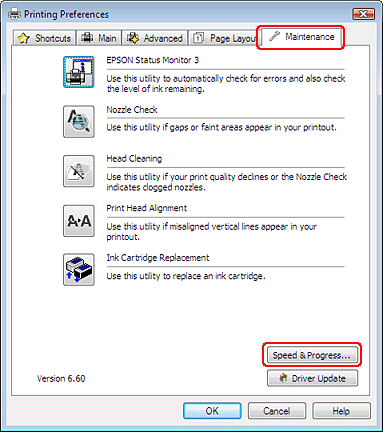 Puteţi mări viteza de tipărire prin selectarea anumitor parametrii în fereastra Speed & Progress (Viteză & Progres). Faceţi clic pe butonul Speed & Progress (Viteză & Progres) din fereastra ’Maintenance (Întreţinere) a driverului imprimantei.