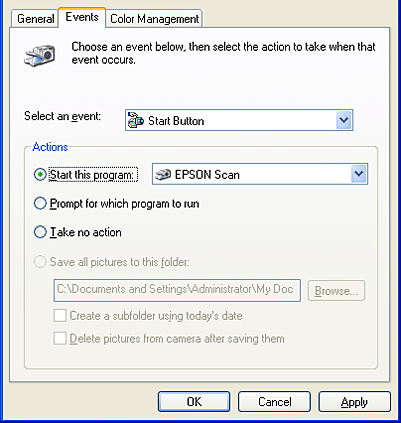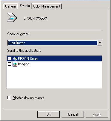 În lista Scanner events (Evenimente scaner), asiguraţi-vă că este selectat Start Button (Buton Start).